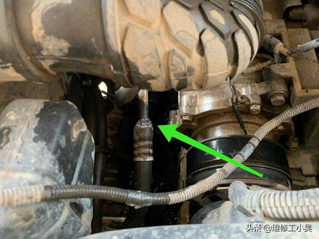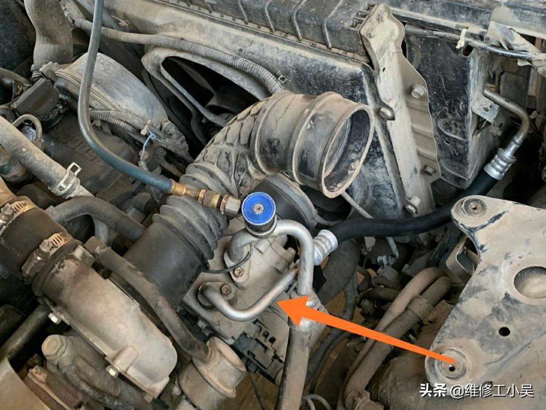 接下来,我们用30张图片,来详细了解一下修理过程,这一篇是小编用图最多的一篇。这根高压管道连接压缩机到冷凝器,下图箭头所示的是管道与压缩机结合位置。