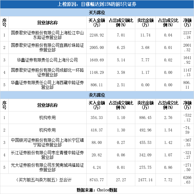 买一为国泰君安证券上海松江中山东路证券营业部,该席位买入2248.92万元,卖出11.74万元,净买额为2237.18万元。近三个月内该席位共上榜149次,实力排名第27。国泰君安证券上海松江中山东路证券营业部今日还参与了常山药业(净买额2245.38万元)。