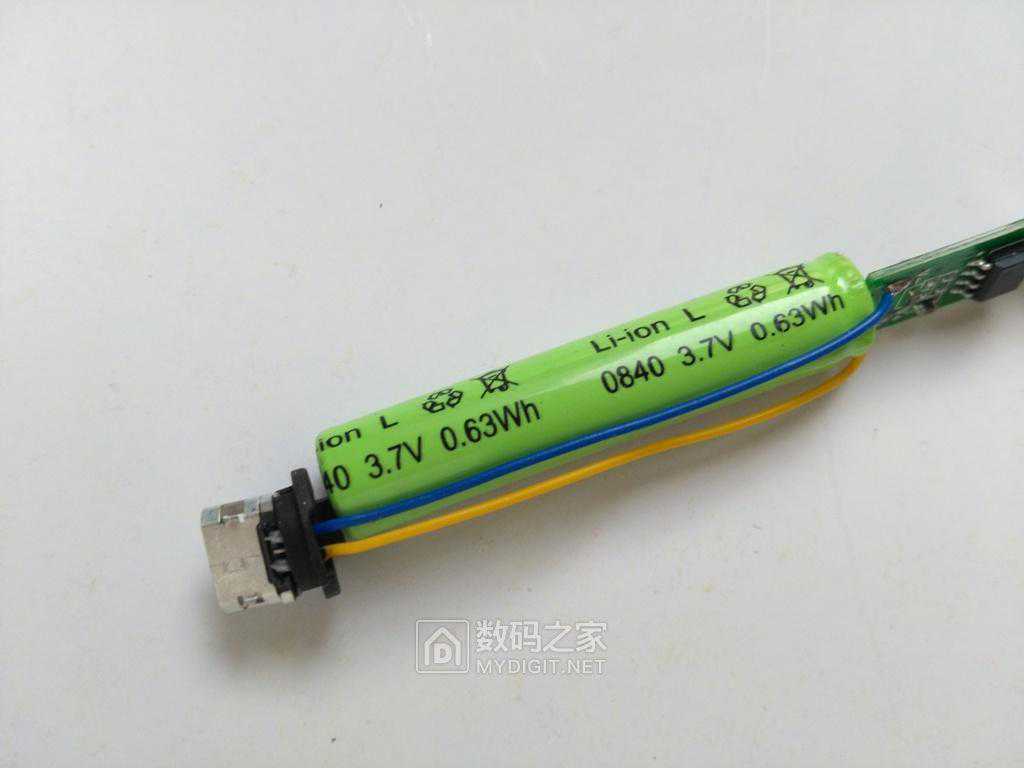 锂电池采用0840型,3.7V,0.63Wh,容量很小,大约可以点两包烟用: