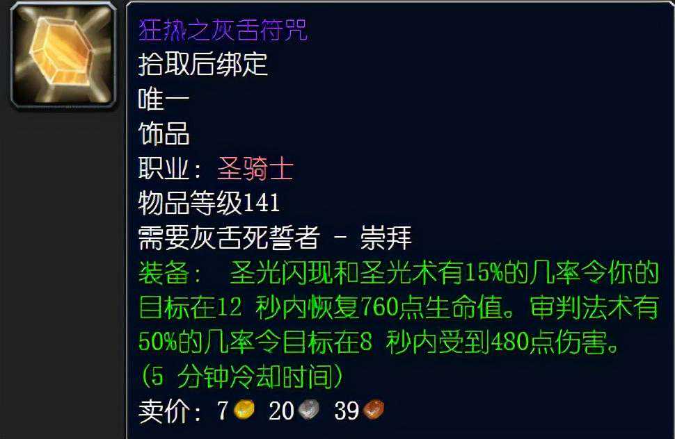 对于奶骑来说,这效果实在不怎样,奶骑一般加主坦,主坦有小D保持三花,回春,根本不差这点HOT,对于惩戒或防护来说,480点伤害并不受法伤加成,基本上等于提升30点的DPS,对于人均在1500以上DPS水平来说,30点DPS实在不够看。总体来说是比较鸡肋的一个饰品。推荐指数一颗星★
