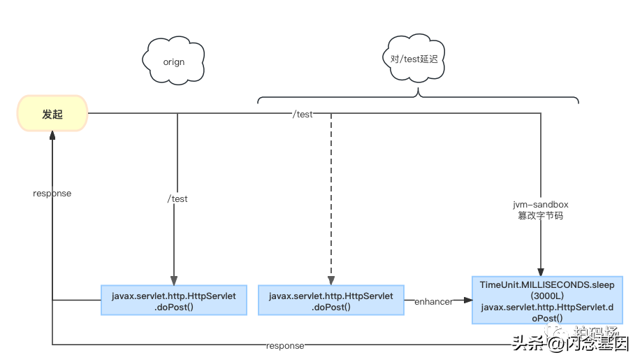 (StringtargetName,ClassLoaderclassLoader,StringclassName,Objectobject,Methodmethod,Object[]methodArguments)throwsException{//StatusManagerif(!().expExists(targetName)){return;}EnhancerModelmodel=doBeforeAdvice(classLoader,className,object,method,methodArguments);if(model==null){return;}(targetName).setMethod(method).setObject(object).setMethodArguments(methodArguments);(model);}2.5.2创建混沌实验./bladecreateservlet--requestpath=/topicdelay--time=3000该命令下发后,触发SandboxModule@Http("/create")注解标记的方法,将事件分发给处理在判断必要的uid、target、action、model参数后调用handleInjection,handleInjection通过状态管理器注册本次实验,如果插件类型是PreCreateInjectionModelHandler的类型,将预处理一些东西。同时如果Action类型是DirectlyInjectionAction,那么将直接进行故障能力注入,如jvmoom等,如果不是将加载插件。如果ModelSpec是PreCreateInjectionModelHandler类型,且ActionSpec的类型是DirectlyInjectionAction类型,将直接进行故障能力注入,比如JvmOom故障能力,ActionSpec的类型不是DirectlyInjectionAction类型,将直接加载插件。