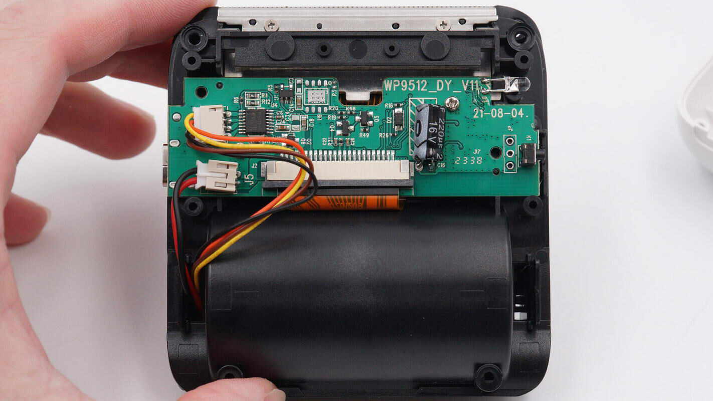 充电头网通过拆解了解到,打印机内部由PCBA模块,热敏打印头,走纸电机和锂电池组成。其中走纸电机为步进电机,锂电池设有保护板,PCBA模块设有电机驱动芯片,蓝牙芯片和锂电池充电芯片。各个部分均通过插接件和排线连接,便于组装生产。