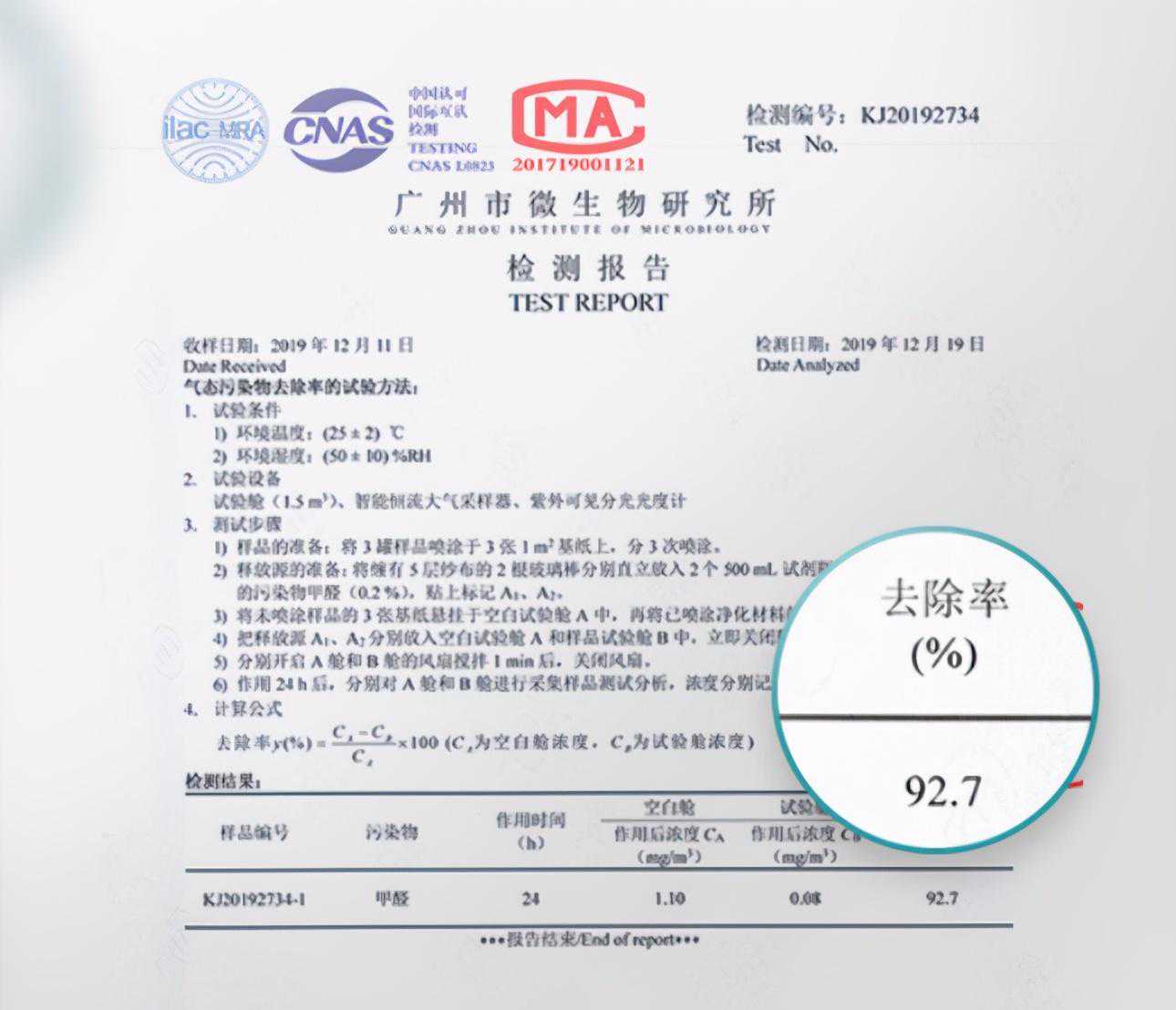 经过广东微生物研究所的相关测试,一觅除螨剂24小时对甲醛的去除率高达92.7%!