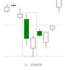 12、好友反攻形态介绍:上涨形态。在下跌趋势中,出现一根中阴线或大阴线,紧接着出现一根跳空低开但随即上涨的中阳线或大阳线,其收盘价与前根阴线的收盘价基本相同,这种形态称为好友反攻。