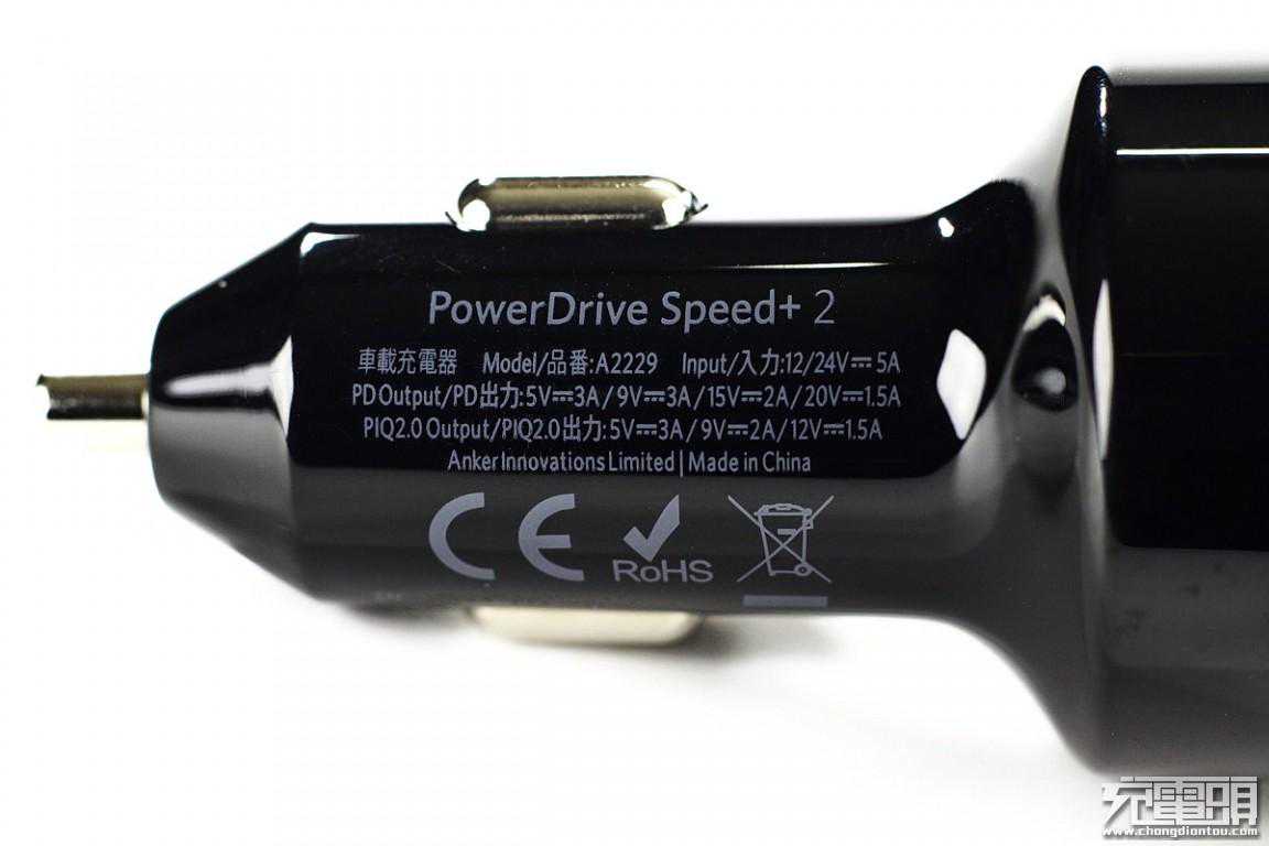 产品名称PowerDriveSpeed+2,产品型号A2229,输入为12-24V5A,USB-C口支持PD输出,规格为5V/3A、9V/3A、15V/2A、20V/1.5A,USB-A口支持输出,规格为5V/3A、9V/2A、12V/1.5A,产品已经通过了CE和RoHS认证。