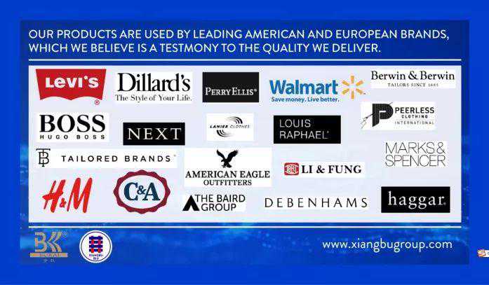 经过二十年的积累他们已成为国内外知名品牌的主要指定供应商,主要品牌有:Levis,Gap,AEO,Haggar,PerryEllis,Dillard’s,Peerless,Lanier,TailoredBrands(Men’sWarehouse),LouisRaphael,MS,Next,CA,HUGOBOSS、Uniqlo(优衣库),Selected(斯莱德)、海澜之家、九牧王、新郎、红豆、威可多等。