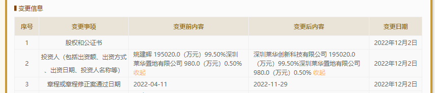 乐居财经王敏12月5日,工商信息显示,深圳莱华实业有限公司大股东从宝新置地(00299)董事长“姚建辉”变更为“深圳莱华创新科技有限公司”;姚建辉退出深圳莱华实业有限公司99.50%股份,深圳莱华创新科技有限公司接盘。