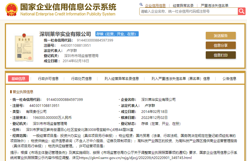 深圳莱华实业有限公司成立于2014-02-18,法定代表人为卢学群,注册资本为196000万元。公司经营范围包括投资兴办实业(具体项目另行申报);物业租赁;国内贸易等。公司对外投资企业2家,目前1家为存续状态。
