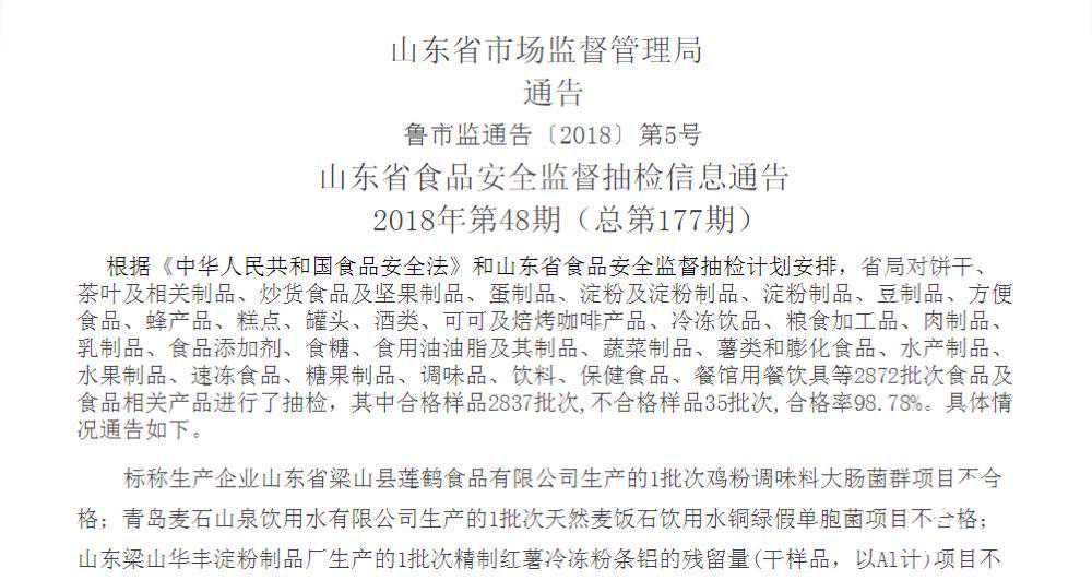 齐鲁网11月7(记者何则伟)山东省市场监管局今天发布今年第48期食品抽检结果,山东天康生物科技股份有限公司、威海康博尔生物药业有限公司、山东百家兴农业科技股份有限公司等企业生产的35批次食品不合格。