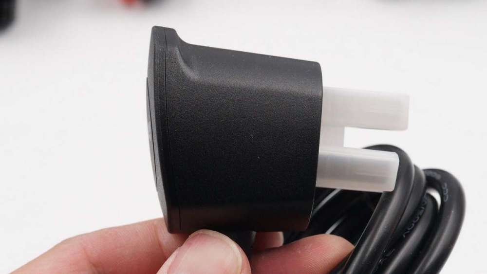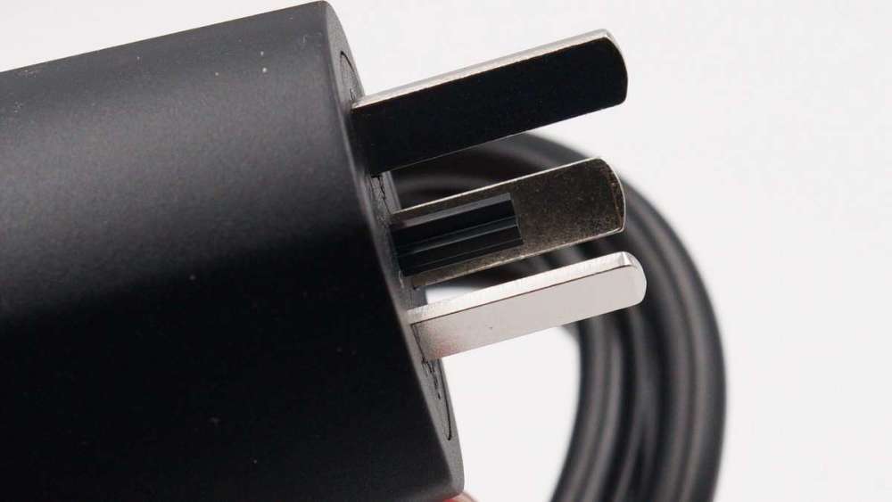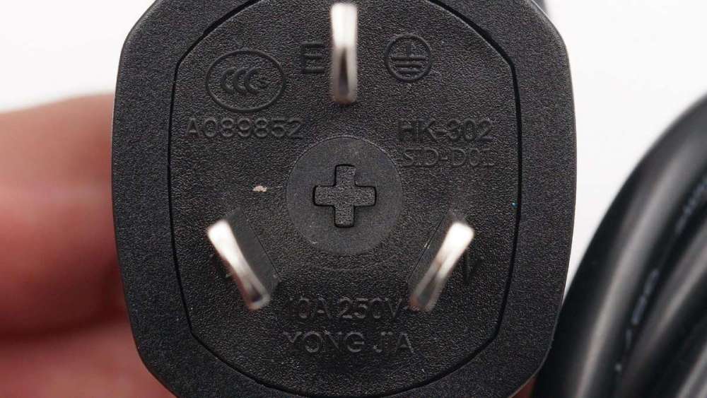 电源线插头前端内凹方便插拔,插脚套有塑料保护壳。