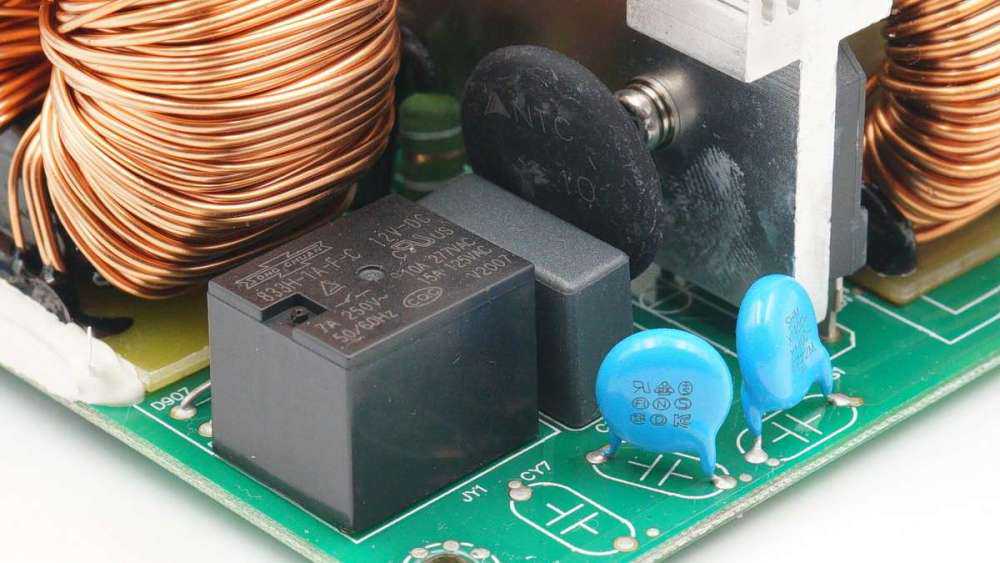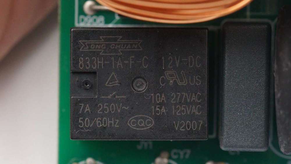右侧一角设有两颗Y电容、NTC浪涌抑制电阻、滤波电容以及延时继电器。