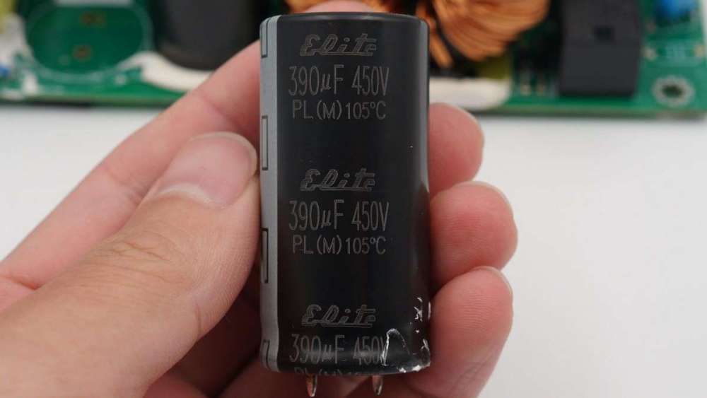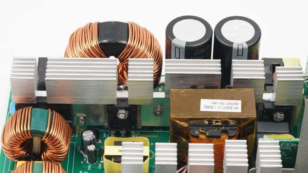 侧边设有PFC升压电感、两颗高压滤波电解电容以及滤波电感,散热片上固定有MOS管。