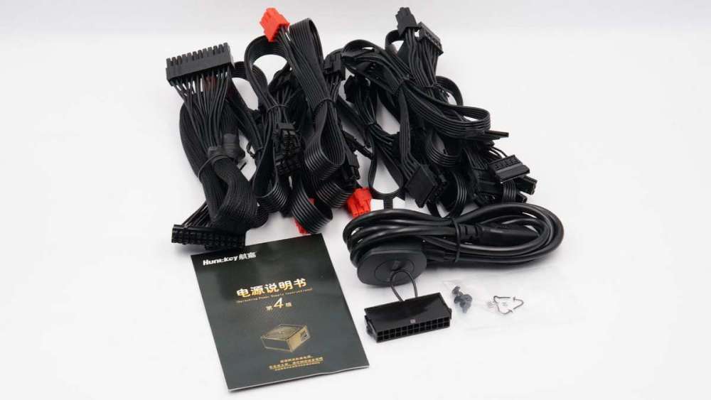 除电源外,包装内附带有说明书、全模线材、电源线和一个强制开机插座。