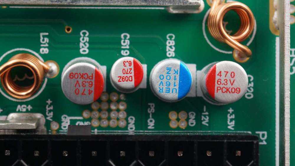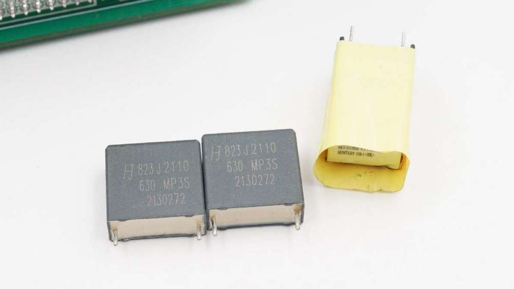 滤波电容特写,分别是6.3V470μF、6.3V270μF以及16V100μF三种规格。