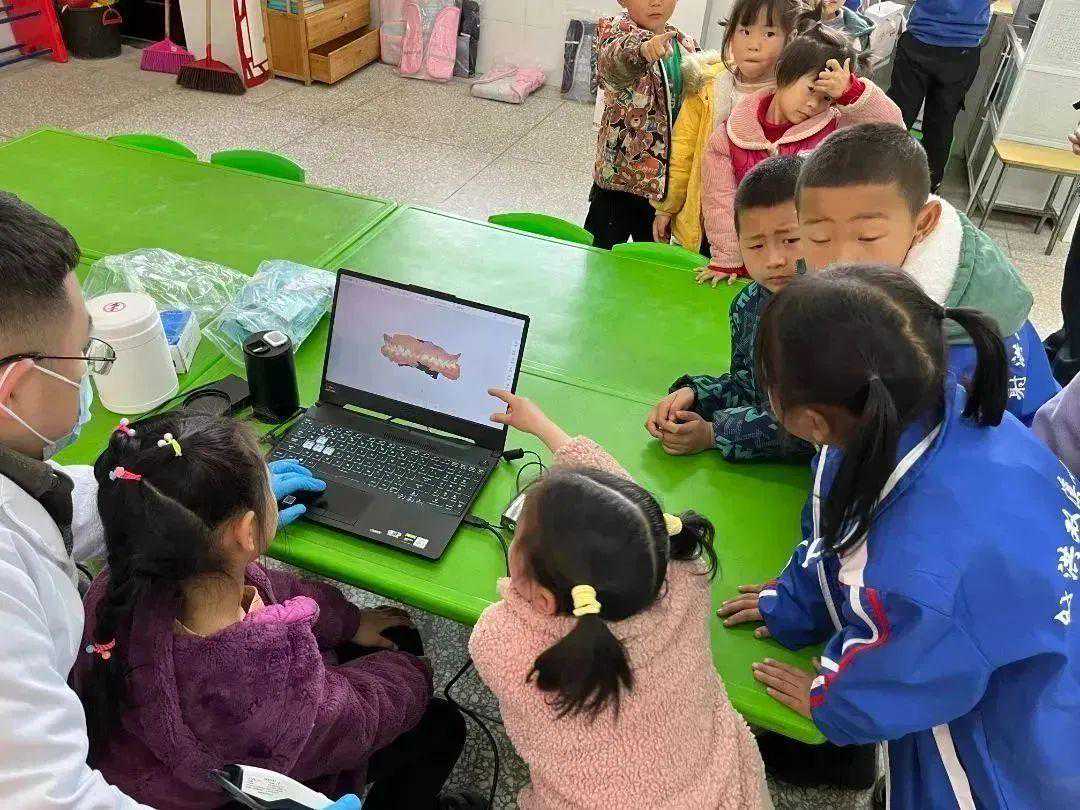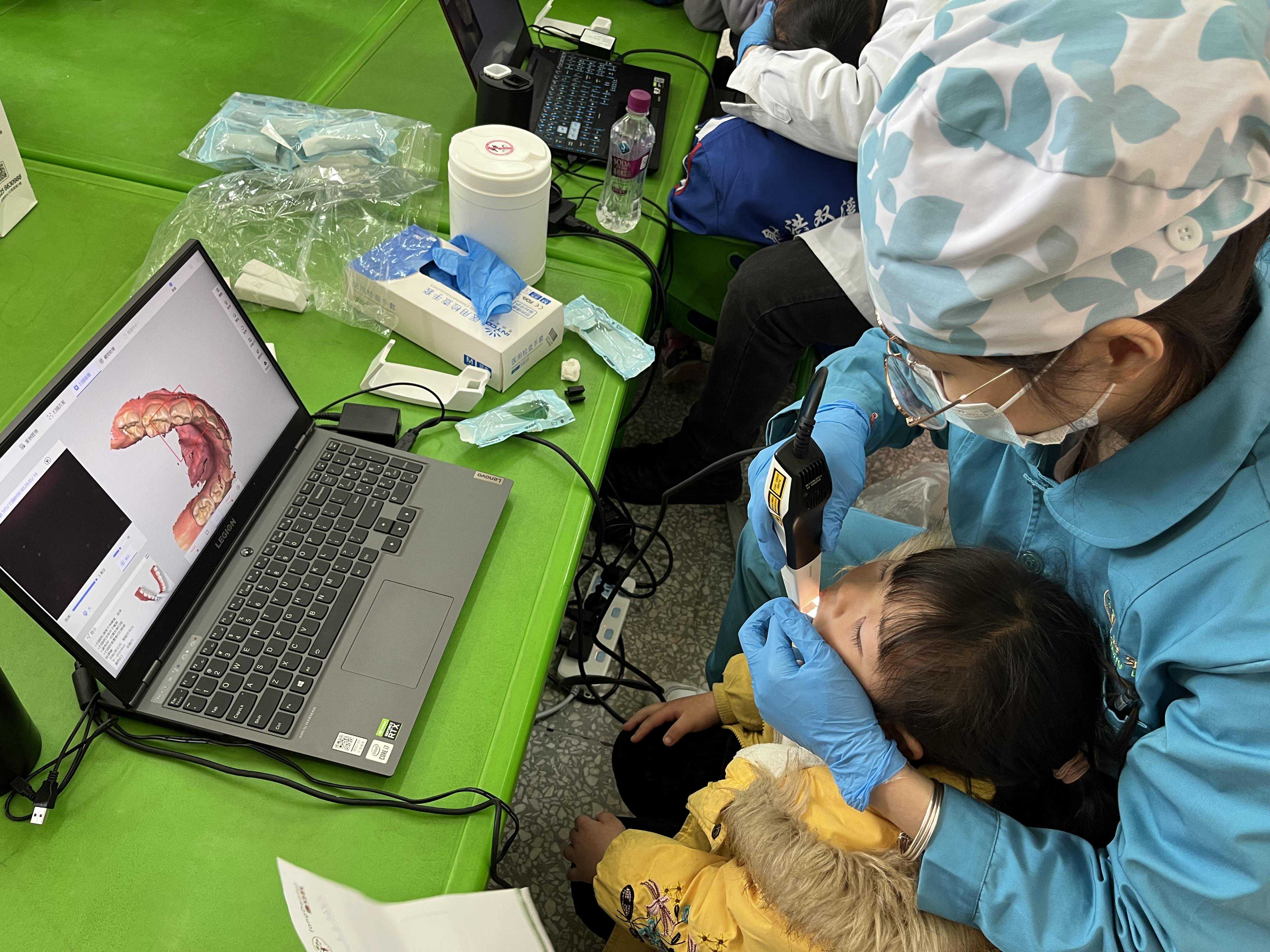 频泰科技市场部培训讲师余弘樑老师和射洪唐牙科的医生手持PANDA系列口腔数字印模仪依次为孩子们进行口内扫描,并耐心地告诉孩子们口内扫描的每一个步骤,以缓解孩子们检查时的紧张与恐惧,当小朋友第一次看到自己的牙齿时都兴奋不已。