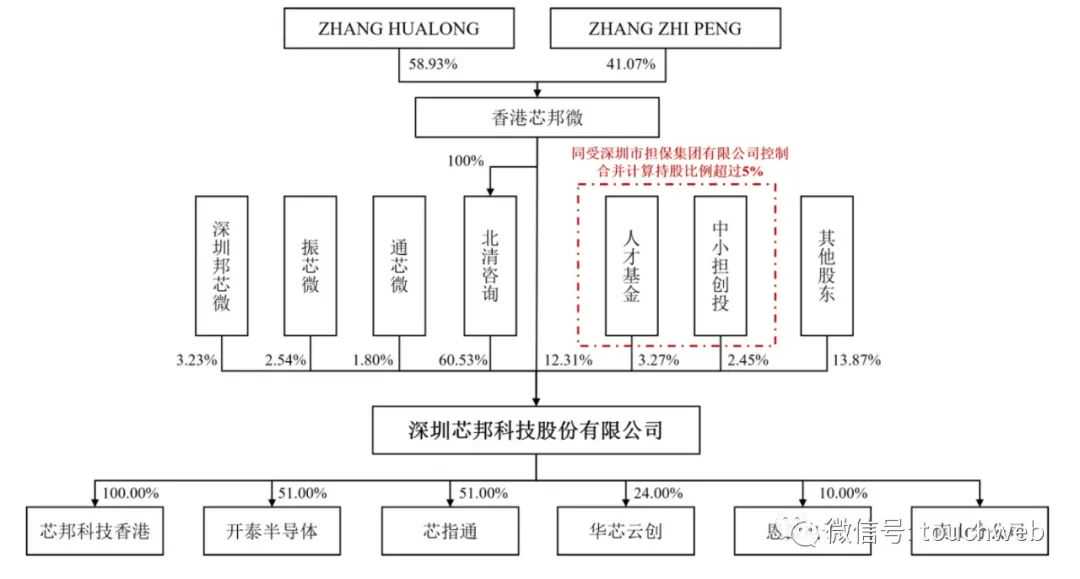 截至本招股说明书签署日,ZHANGHUALONG、ZHANGZHIPENG分别直接持有香港芯邦微58.93%、41.07%的股权。香港芯邦微直接持有芯邦科技12.31%股份,并通过北清咨询间接持有芯邦科技60.53%股份。