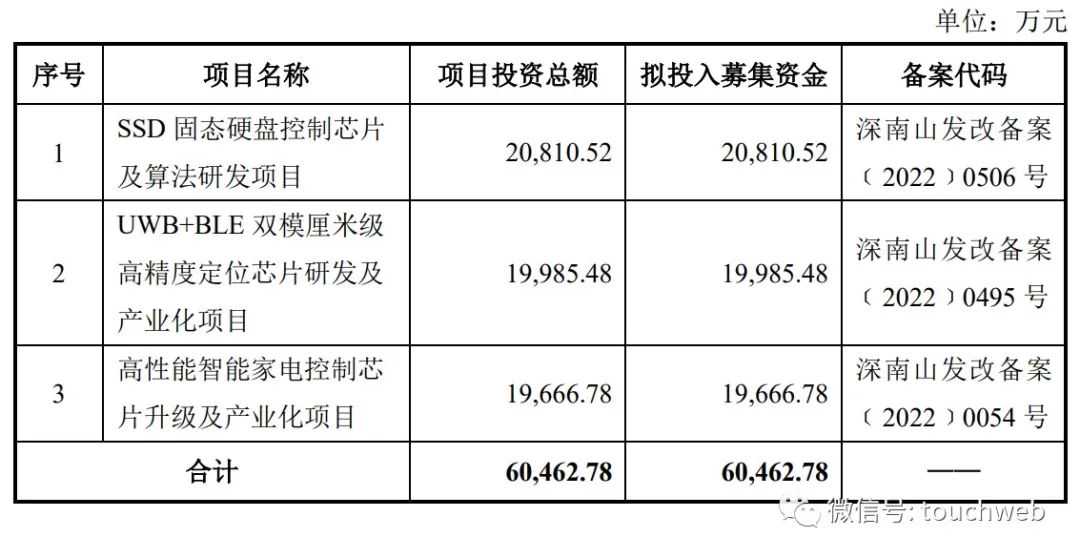 其中,2.08亿元用于SSD固态硬盘控制芯片及算法研发项目,2亿元用于UWB+BLE双模厘米级高精度定位芯片研发及产业化项目,1.97亿元用于高性能智能家电控制芯片升级及产业化项目。