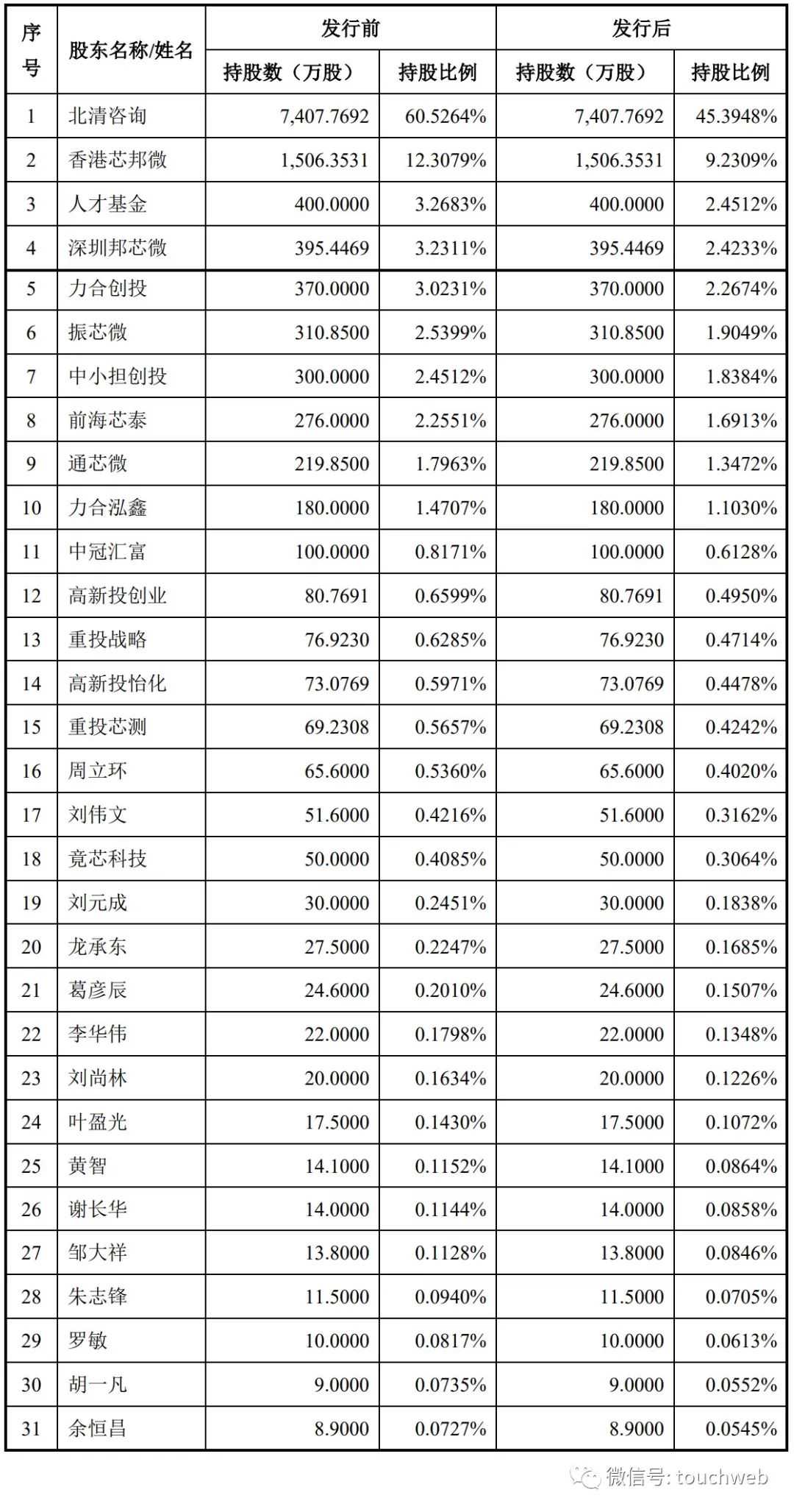 IPO前,人才基金持股为3.2683%,深圳邦芯微持股为3.2311%,力合创投持股为3.0231%,振芯微持股为2.5399%,中小担创投持股为2.4512%,前海芯泰持股为2.2551%;