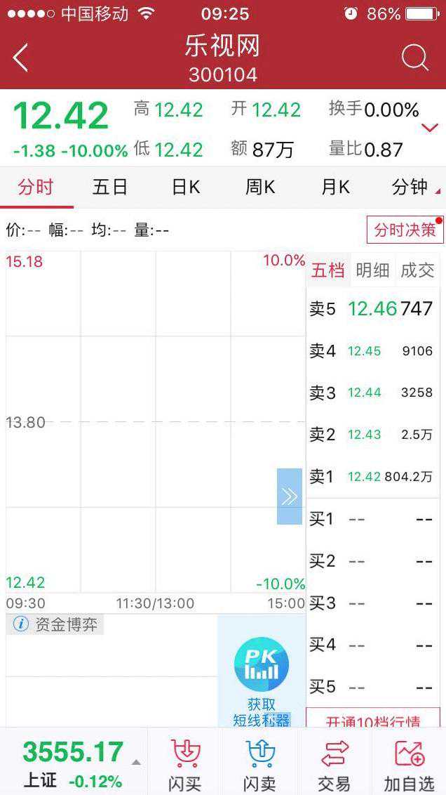 今天乐视网开盘后,连续第二天一字板跌停。目前乐视网股价为12.42元。昨天,乐视网复牌,开盘后随即一字板跌停。