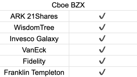 上市交易所芝加哥期权交易所(CboeBZXExchange)11个比特币现货ETF中,ARK21Shares、WisdomTree、景顺/Galaxy、VanEck、富达与富兰克林邓普顿这6家选择在芝加哥期权交易所上市。