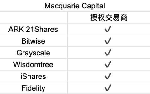麦格理资本(MacquarieCapitalUSAInc)据11份ETF文件显示,MacquarieCapital(USA)Inc.是6个比特币现货ETF的授权交易商,包括ARK21Shares、Bitwise、灰度、WisdomTree、贝莱德、富达。