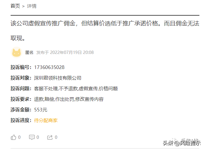 金牛申卡自称终身免费加入,高额佣金且结算快,单卡佣金高达520元。合伙人享有多重奖励,例如推广奖,享全额100%佣金奖励;行动奖,最高奖励28元/张。此外月月都有额外推广活动,拿高额奖励。然而北青网健康却在黑猫投诉平台上看到,君领科技公司却被消费者投诉虚假宣传,佣金结算低于其承诺的价格。且佣金难以取现。最后,北青网健康提醒广大网友,遇到商家承诺的“高额佣金”,“全额奖励”,请谨慎参与,避免财务损失。