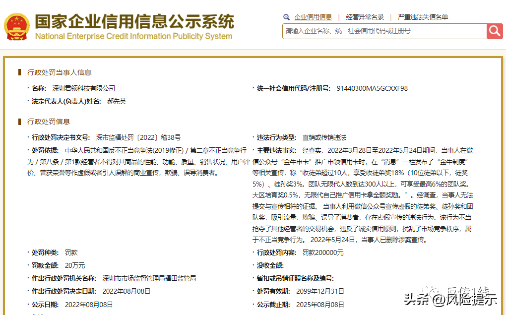 该公司主要违法事实为:经福田市监查实,2022年3月28日至2022年5月24日期间,当事人君领科技在微信公众号“金牛申卡”推广申领信用卡时,在“消息”一栏发布了“金牛制度”等相关宣传,称“收徒弟超过10人,享受收徒弟奖18%(10位徒弟以下,徒奖5%)、徒孙奖3%。团队无限代人数到达300人以上,可享受最高6%的团队奖。大区培育奖0.5%,无限代自己推广信用卡拿全额奖励。”。经福田市监调查,君领科技无法提交与宣传相符的证据。