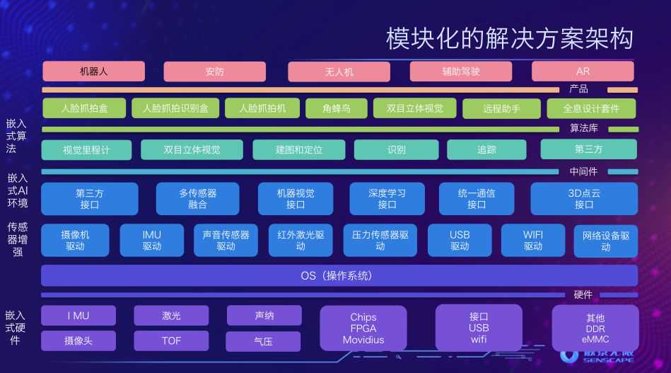 这是我们模块化结构解决方案的框架,底层主要是嵌入式硬件;芯片层有Movidius和FPGA,前段时间我们刚刚投资了一家美国FPGA团队,预计今年下半年推出基于FPGA的具体方案,首先我们会集成多种嵌入式硬件传感器,在此基础上,也会提供不同的前端驱动,包括第三方接口、多传感器融合接口、机器视觉接口、深度学习接口,统一通信接口以及3D点云接口。