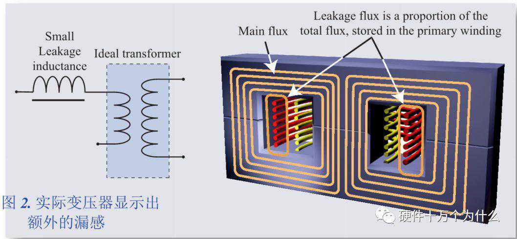 在实际的变压器中,初级线圈的某些磁通量不会耦合到次级线圈。这些“漏掉”的磁通量不会参与变压器的工作,可以表示为额外的与线圈串联的感性阻抗(图2)。