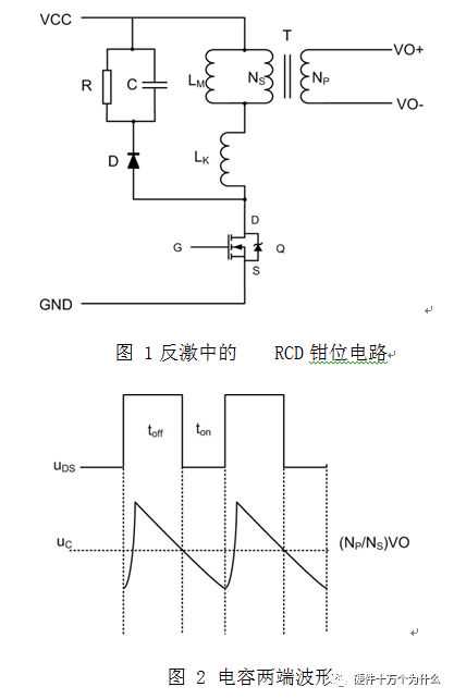 因此RCD钳位电路以其简洁易实现多用于小功率场合。图1和图2分别为反激电路中的RCD钳位电路和电容C两端的电压波形。