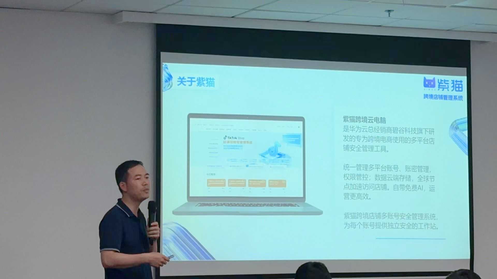 此次活动主办方,紫猫跨境云电脑CEO大超为大家介绍了紫猫跨境云电脑如何助力商家实现高效多店铺管理。他表示,做跨境电商运营,一款好用的店铺管理工具是制胜先机。紫猫云电脑注重多节点加速和网络加密,保护店铺安全。并展示了紫猫跨境云电脑在节省成本方面的显著优势,通过AI赋能,紫猫AI可以很好的帮助卖针对家降低人工成本,提升运营效率。