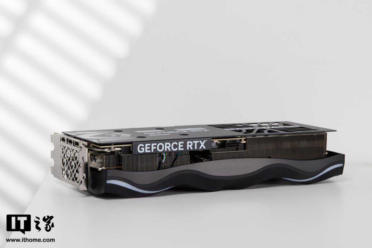 显卡散热模组由黑白两大元素组成,表面嶙峋的纹理灵感来自黑曜石。仅仅这么看的话,这张康似乎非常朴素,完全看不出来有炫光的样子。