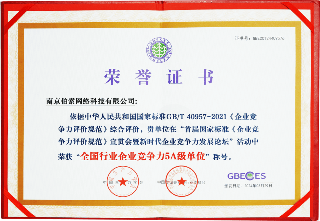 南京伯索网络科技有限公司(以下简称“伯索科技”)被成功评选为“全国行业企业竞争力5A级单位”。