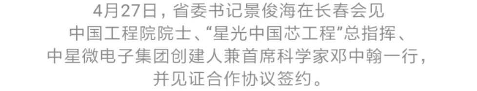 4月27日,省委书记景俊海在长春会见中国工程院院士、“星光中国芯工程”总指挥、中星微电子集团创建人兼首席科学家邓中翰一行,共同见证中国一汽集团与中星微电子集团签署合作协议,并为汽车芯片联合实验室揭牌。
