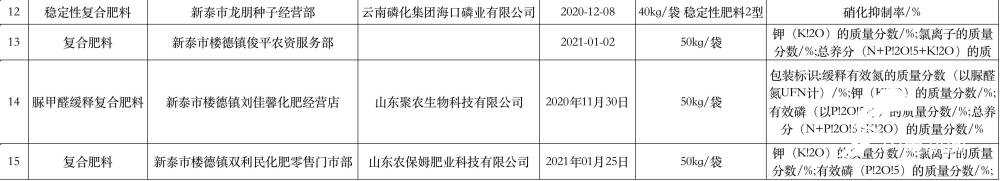 本次抽查发现15批次产品不符合相关标准的要求,不合格项目为效磷、钾、总养分、氯离子、缓释有效氮、缓释养分量、控释养分量、硝化抑制率、包装标识。