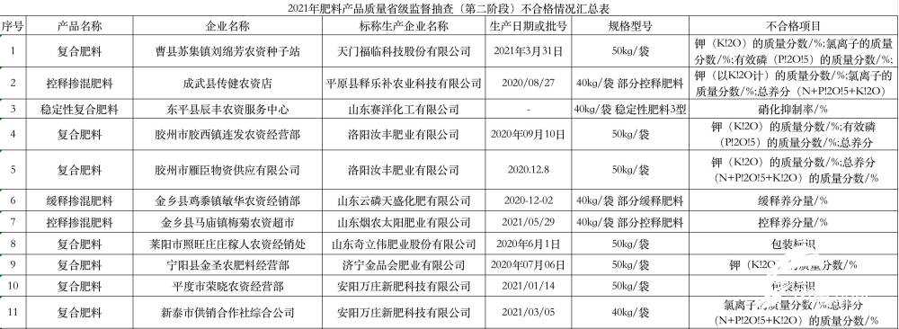 齐鲁网·闪电新闻4月25山东省市场监管局日前发布2021年第二阶段肥料产品质量省级监督抽查结果,结果显示,天门福临科技股份有限公司、云南磷化集团海口磷业有限公司、山东赛洋化工有限公司、洛阳汝丰肥业有限公司、安阳万庄新肥科技有限公司、山东云磷天盛化肥有限公司、山东烟农太阳肥业有限公司、山东奇立伟肥业股份有限公司、济宁金品会肥业有限公司、山东聚农生物科技有限公司、山东农保姆肥业科技有限公司等生产或销售的15批次食品不合格。