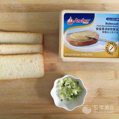 4、把涂完黄油的面包片表层撒一些葱花。