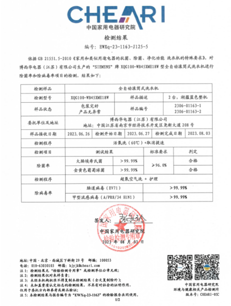博西家电旗下西门子iQ300超氧洗衣机WB45XME18W除病毒检测证书