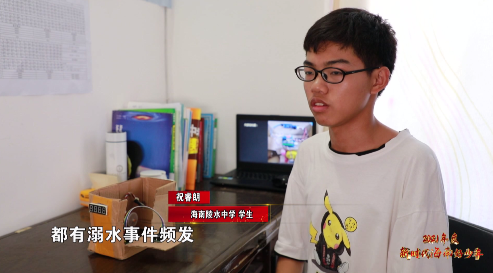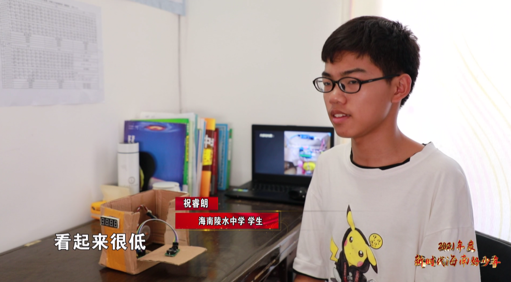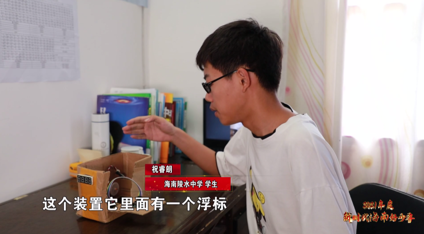 眼前这位阳光的男孩叫祝睿朗,是陵水黎族自治县陵水中学的学生,刚刚研究的这个装置,便是这位科技小达人主导发明的水位提醒器。