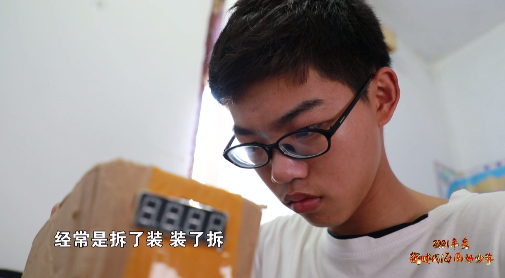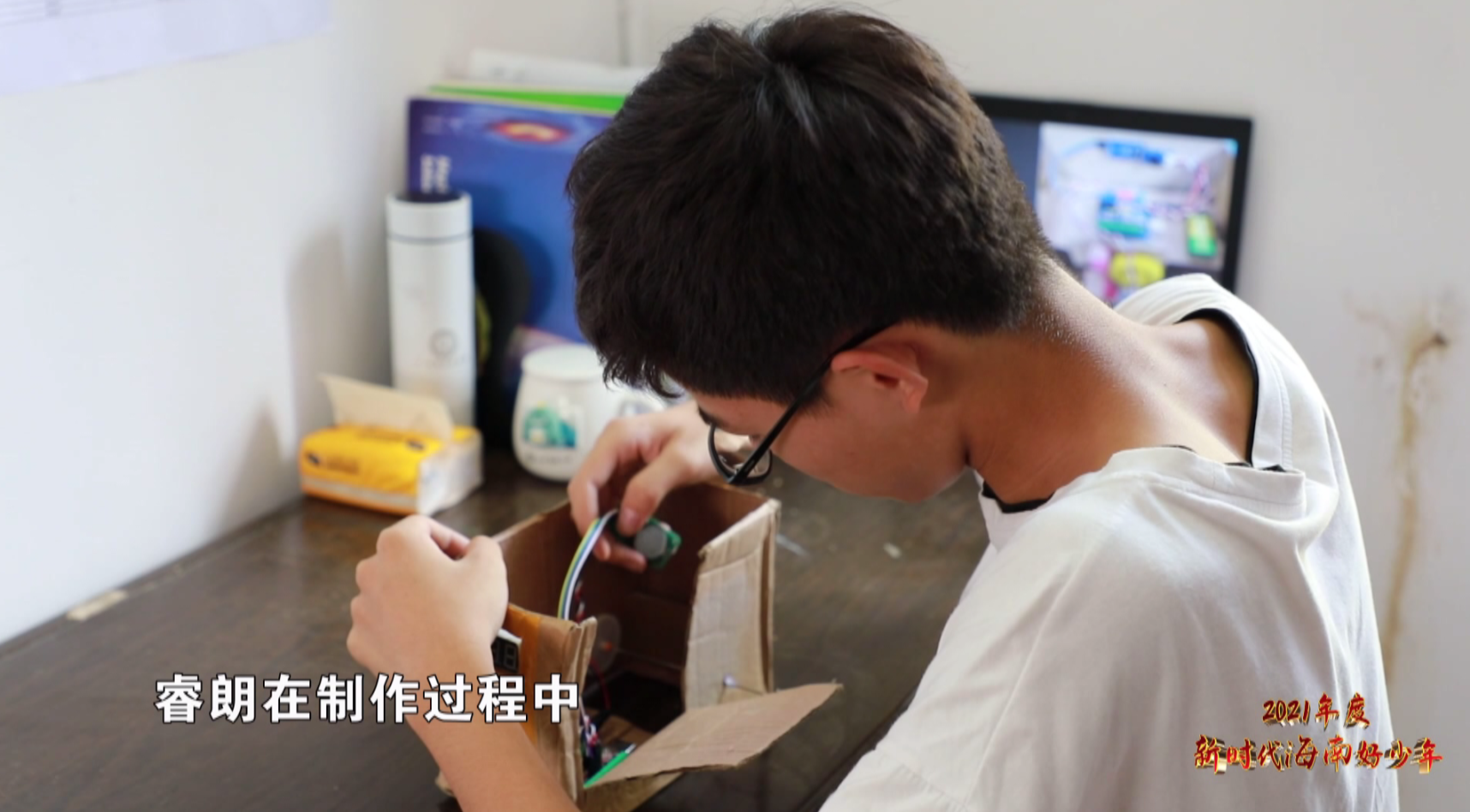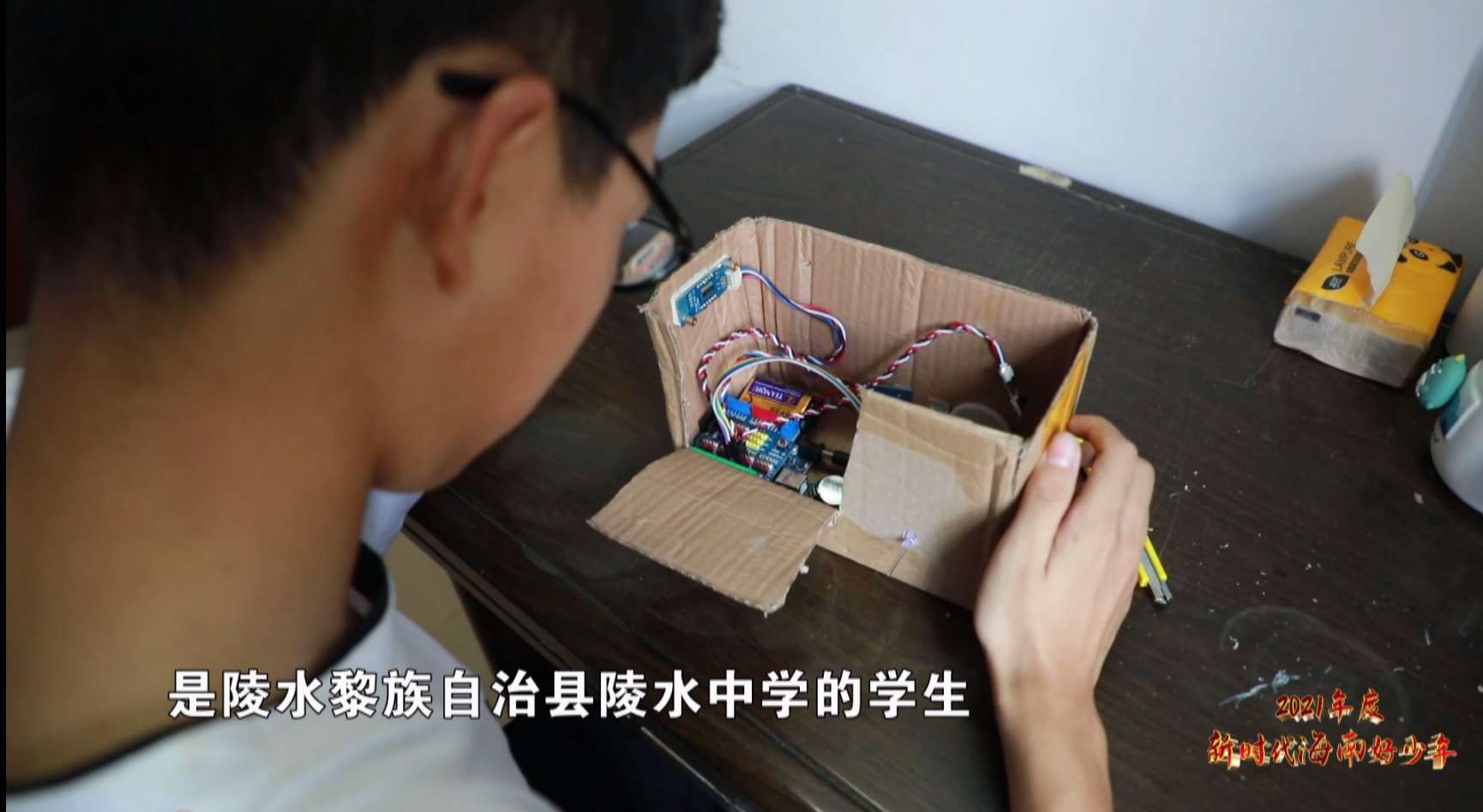 眼前这位阳光的男孩叫祝睿朗,是陵水黎族自治县陵水中学的学生,刚刚研究的这个装置,便是这位科技小达人主导发明的水位提醒器。