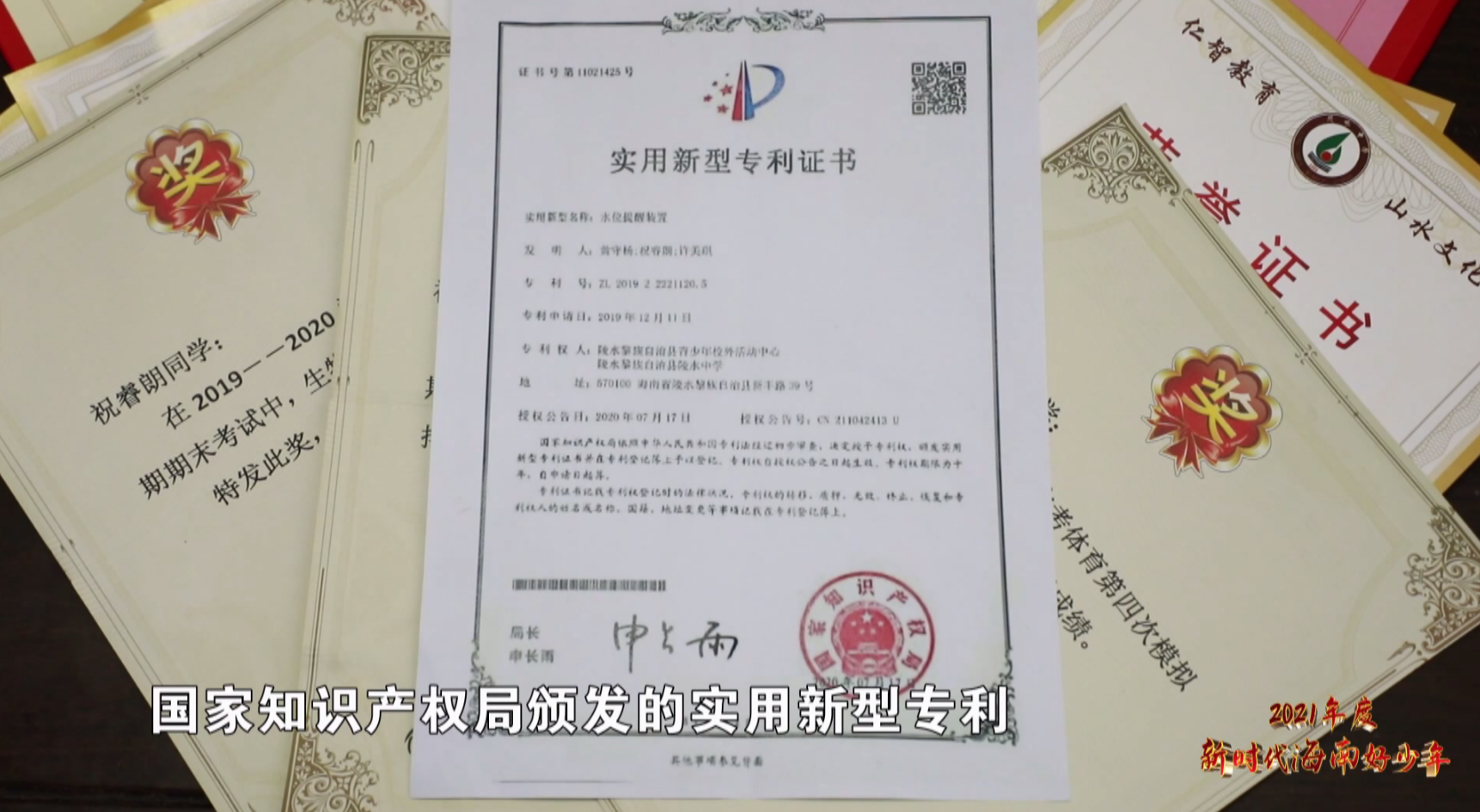 功夫不负有心人,睿朗和团队一起合作制作的水位提醒装置,在2020年7月获得了国家知识产权局颁发的实用新型专利,在第32届海南省青少年科技创新大赛上他的水位提醒装置还获得三等奖。