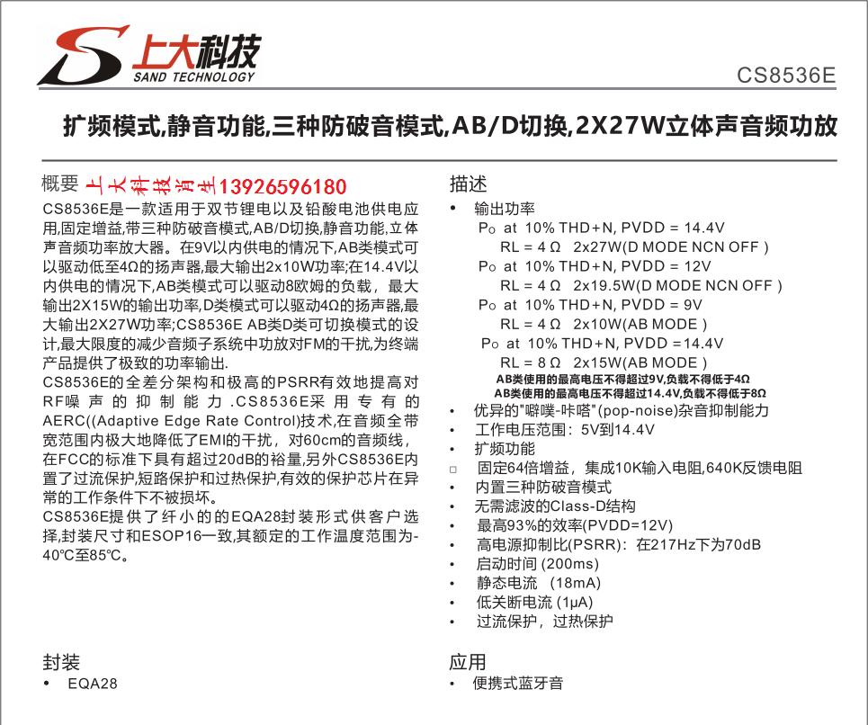 CS8536E是一款适用于双节锂电以及铅酸电池供电应用,固定增益,带三种防破音模式,AB/D切换,静音功能,立体声音频功率放大器。在9V以内供电的情况下,AB类模式可以驱动低至4的扬声器,最大输出2x10W功率;在14.4V以内供电的情况下,AB类模式可以驱动8欧姆的负载,最大输出2X15W的输出功率,D类模式可以驱动4Ω的扬声器,最大输出2X27W功率;CS8536EAB类D类可切换模式的设计,最大限度的减少音频子系统中功放对FM的干扰,为终端产品提供了极致的功率输出。