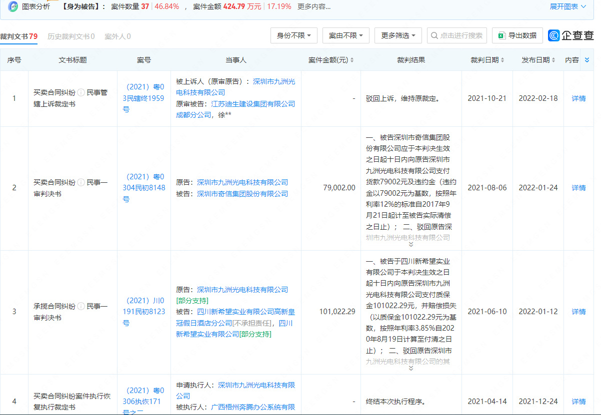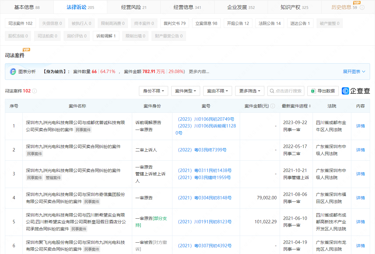 一、在APP“企查查”中,深圳市九洲光电科技有限公司作为诉讼当事人、行政处罚当事人,企业风险信息仍旧有如下公示记录(部分截图):