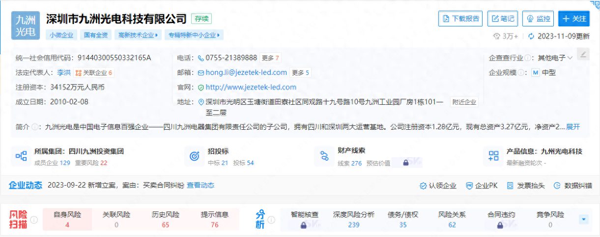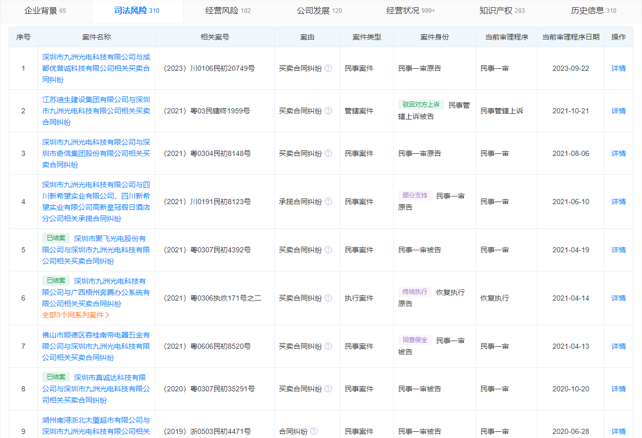 二、在APP”“天眼查”上,深圳市九洲光电科技有限公司作为诉讼当事人、行政处罚当事人,企业风险信息仍旧有如下公示记录(部分截图):