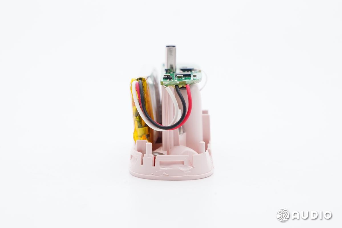 耳机座舱侧边一览,电池通过导线和充电盒主板连接。