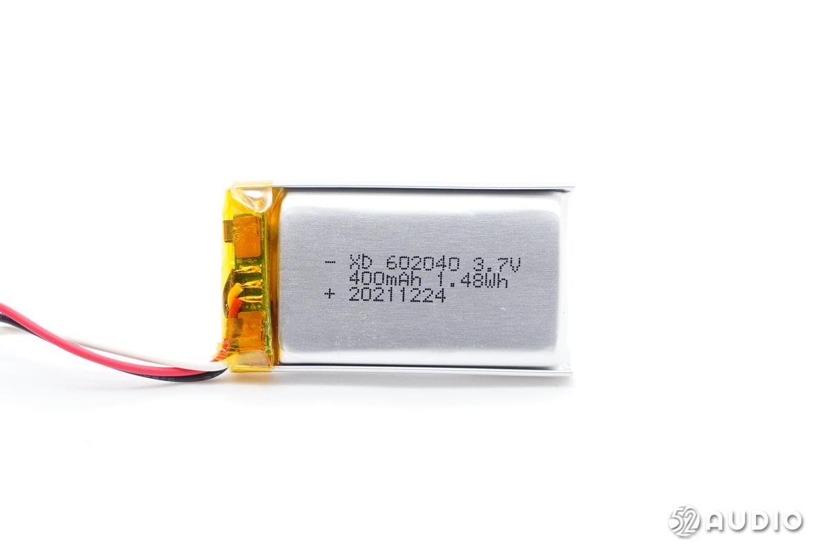 充电盒内部锂离子软包电池型号:XD602040,额定电压:3.7V,额定容量:400mAh/1.48Wh。