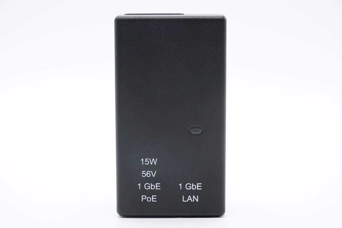 侨威15WPoE供电器采用PC防火材质黑色外壳,表面磨砂抗指纹,边缘圆润过渡。