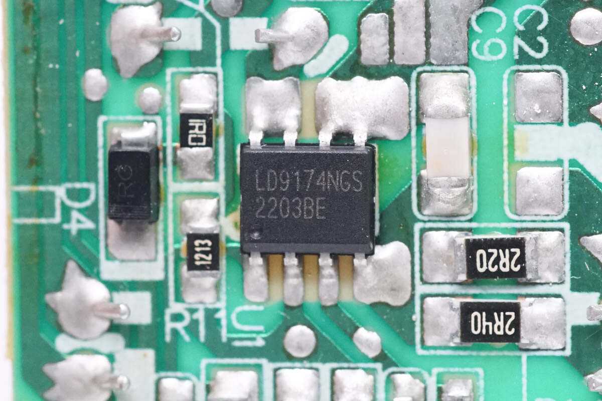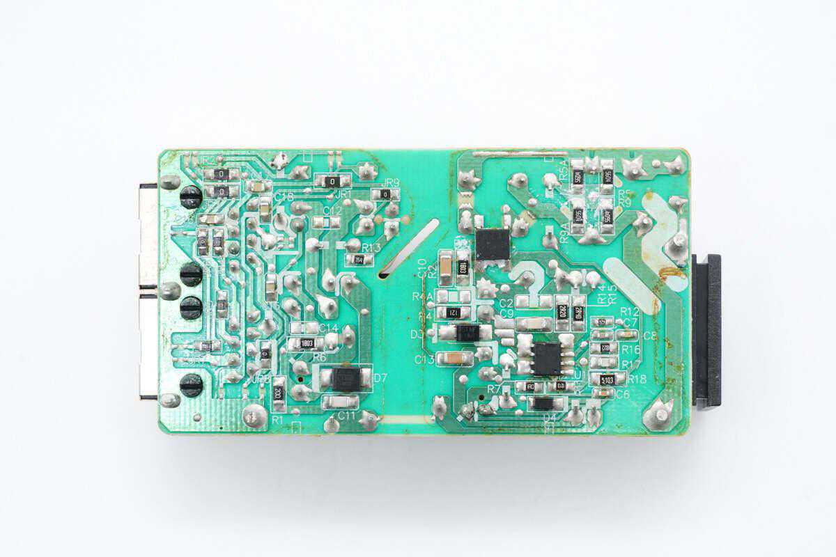 PCBA模块背面焊接整流桥,电源主控芯片和整流二极管。初次级之间分界明显。