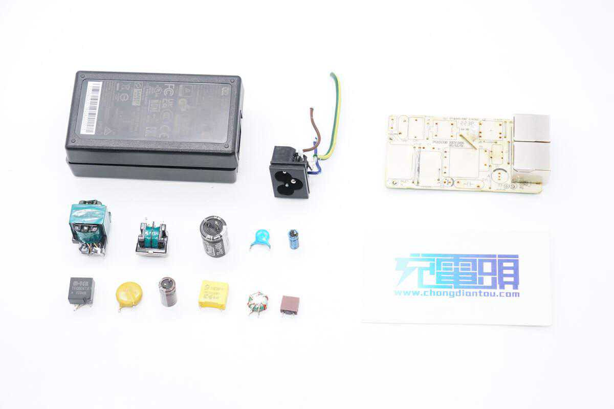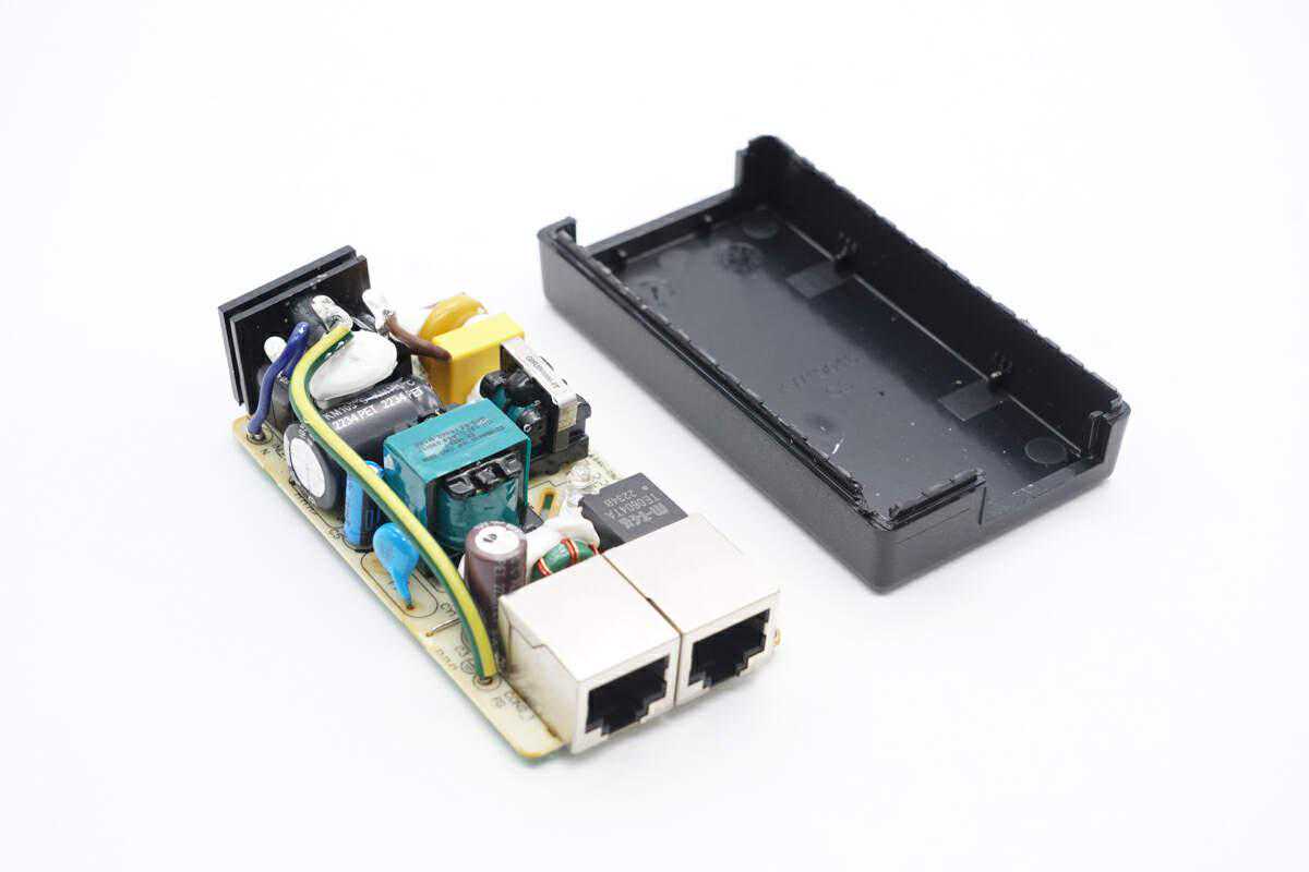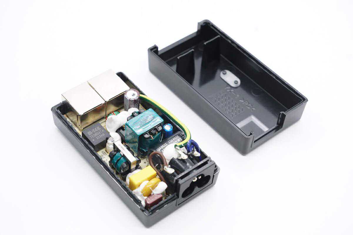 PCBA模块正面一览,右上角为交流输入插座,通过导线焊接连接。下方焊接保险丝,压敏电阻,安规X2电容和共模电感,元件之间通过打胶固定。在上方焊接高压滤波电容和变压器,左侧为输出端,焊接两个RJ45网线接口,上方焊接滤波电容,下方焊接滤波电感。