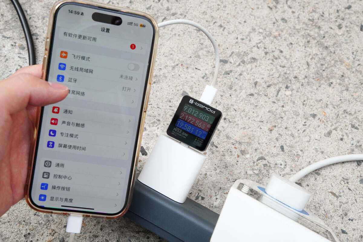 继续将苹果20W充电器套装和iPhone15Pro连接公牛安全放电插座进行使用,使用POWER-ZKM003C测试仪读取手机端输入功率为9.01,功率和连接市电情况下无异,说明安全放电插座正常工作。